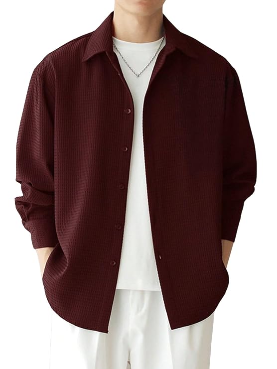 Men’s Solid Polycotton Long Sleeve Shirt – Regular Fit, Textured Waffle-Knit (Made in India)