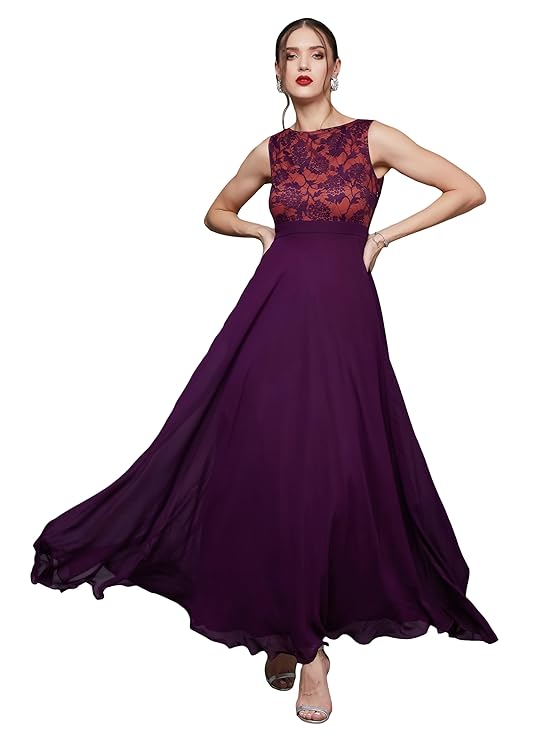 Women’s Georgette Maxi Dress – Sleeveless, Lace Overlay, Elegant Evening Wear (Made in India)