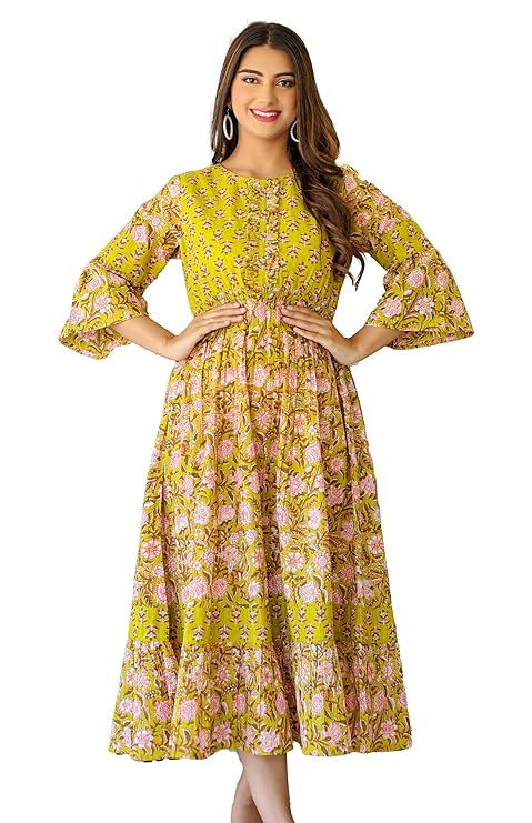 Green Floral Lurex Cotton Anarkali Maxi Dress – Ethnic & Festive Wear (Made in India)